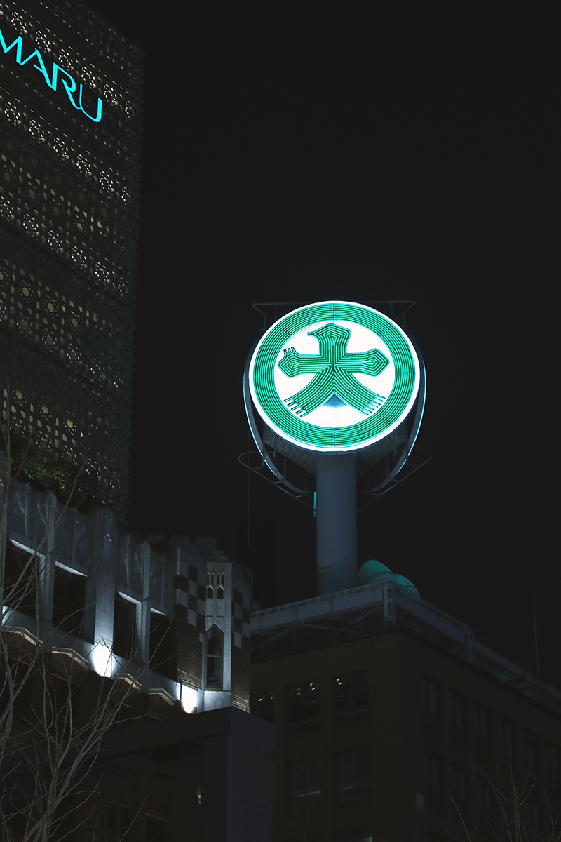 Neon obchodního domu Daimaru. Podmanivé logo Daimaru Mark pochází již z roku 1913. Tento neon se nachází na střeše budovy Daimaru Shinsaibashi v Ósace. Jsme sice Tokyo Vintage ale jiná místa a města máme také rádi. Ósaku moc! Foto © Petr Horčička /TokyoVintage.cz